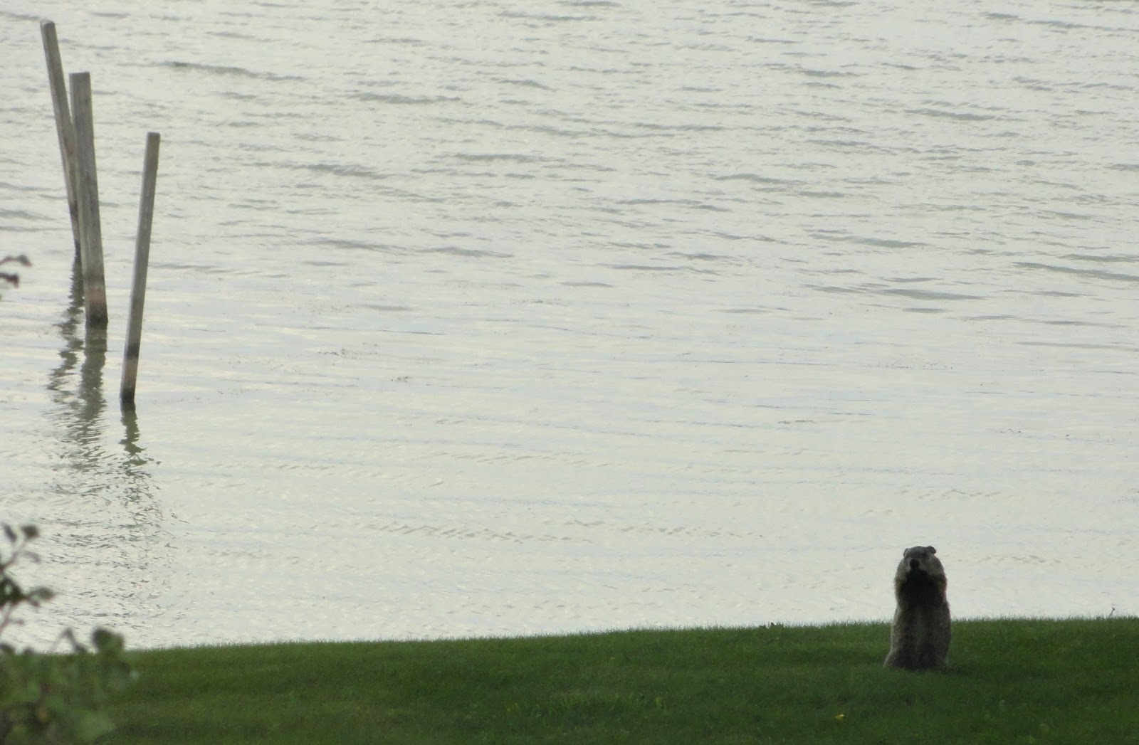 Sometimes when I am writing, I'll pause to allow the next part of a scene to unroll in my mind. I look out the window, gaze at the lake. Yesterday, I saw a groundhog sitting tranquilly in the yard, gazing at the lake. Was he, too, pausing in his work to let his thoughts realign? Or simply to contemplate the serene lake?