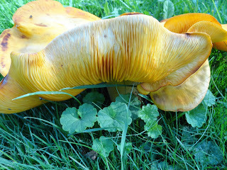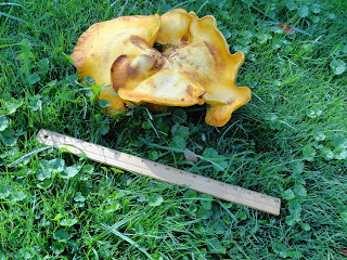 The strange, stunning, giant yellow mushroom in the photos here was in our yard this morning. I've never seen anything quite like it. Had to get down and look closely. Had to grab a ruler so you'd know I wasn't exaggerating. Look underneath: