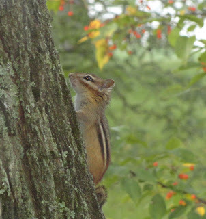 So, now a chipmunk has followed in the squirrel's footsteps and is watching me as I work. When I aim the camera, it turns its head away slightly (as above), as if to deny that it has been spying.