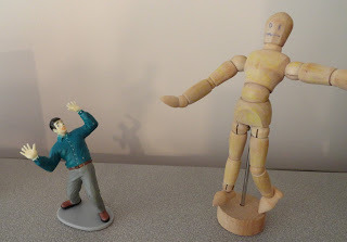 Often we film these mini-dramas (I take photos & compile in slideshows; lately they're doing their own with a Flip camera.) On our recent trip to Maine, we took along some 'B movie figures' that I had found (like the man on the left above) and a couple artist models (like the one at right.)