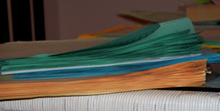 In the above stack, the gold pages (approximately 100) were written between May-July, 2009. The blue were written between August-December, 2009 (only about 30 pages because I was on book tour and in England during that time.) The green pages are the most recent (about 100), written in my recent immersion in North Carolina.