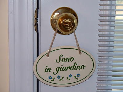 I saw signs like this one, "Sono in giardino" ("I'm in the garden"), in a village in southern Switzerland. Hung on an outside door, it directed visitors around the back to the garden, where the owner was puttering or reclining. I found this sign in the local Migros there and brought it home to use, most often, on my office door.