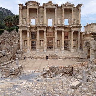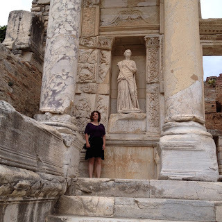 Last May, we visited this library in the ancient city of Ephesus, near Selcuk, Turkey. The building had been destroyed by an earthquake and attacked by Goths -- the actual ones, not the wannabes who dress in black. Archaeologists were able to restore some of the beautiful facade. You can still see four statues of women each representing wisdom, knowledge, intelligence, and virtue. Here's a close up of the marble Sophia with her namesake, our daughter.