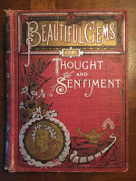Just after the holidays I put away the decorations and began tidying up around the house. Soon I was deep cleaning all of the bookcases. It’s not the most exciting job, but I do enjoy “visiting” my books and keepsakes. This time around the book that caught my attention was BEAUTIFUL GEMS OF THOUGHT AND SENTIMENT. This version has a 1901 copyright and was printed by C.W. Stanton Company, Chicago. I believe it was edited by Henry Davenport Northrop since he’s credited with editing the 1890 version with the same title. This is mostly a poetry anthology broken into sections like THE CHARMS OF NATURE, DESCRIPTIONS AND TALES OF THE SEA, ALBUM OF LOVE, THE SWORD AND THE PLOW. I love it for the poetry and for the way it freezes time and invites a look backward.This time, though, when I opened the pages I noticed something new. Here tucked inside was a message from the book’s original owner: