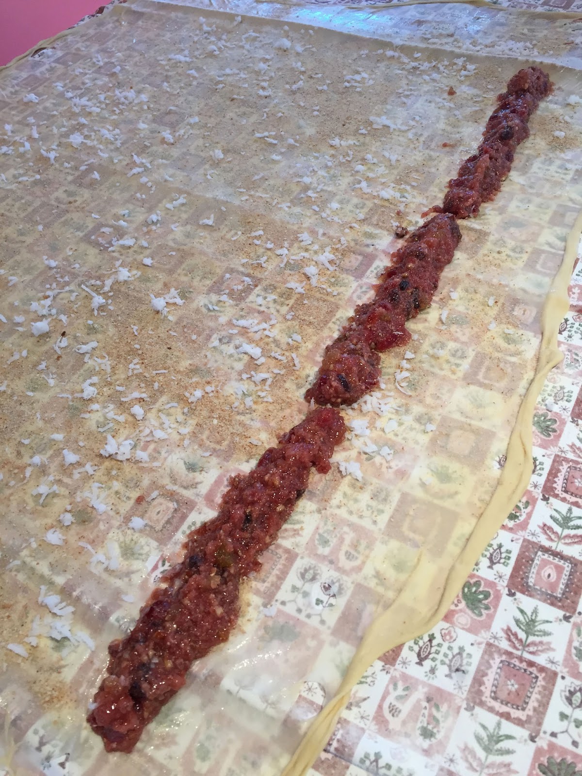 And as showers often do, this one worked again. Thinking about my grandmother’s simple instructions—knead dough, divide into thirds, brush with oil, and rest on board for 60 minutes—I realized that similar to bread dough (though this has no yeast), she must have kneaded in more flour than the recipe called for. I probably worked in at least another cup, and this batch had substance. Again, I let it rest to prepare for what was to come.
