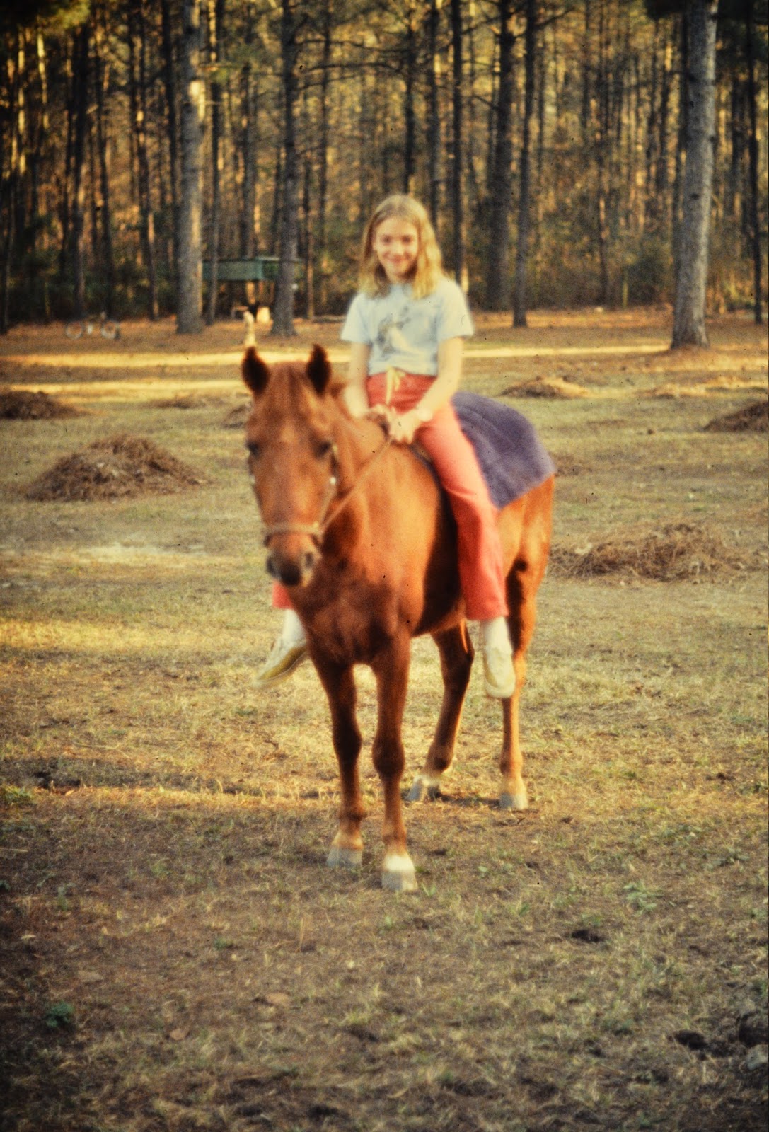 me and RustyDuring the magic years of my childhood we lived in a ranch style house on Willie Rd. in Folsom, Louisiana. The pasture in the back was home to a number of ponies: Cinnamon and Sugar, who were mother and daughter; Rusty, who was a Welsh pony my sister and I turned into a biter by feeding him sugar cubes all the time; Honey, who was the palomino Shetland pony I raised from when she was 6 months old; Cherry who was the only bonafide horse I ever owned. I'll never forget how high in the air I felt whenever I rode her!I adored horses. I read anything and everything, both fiction and nonfiction. The Black Stallion books by Walter Farley, the Chincoteague books by Marguerite Henry. I knew the language, the lingo. I went to horse camp. I picked and groomed and had absolutely no fear. All my writing from those years is horse-centric. I thought I would always have horses in my life.