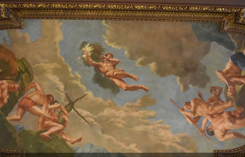 The ceiling on the third floor of the library is covered in murals that depict a history of reading. At the top, we see Prometheus about to give fire to humans. We know from the myths that he will be punished severely for wanting us to have light.