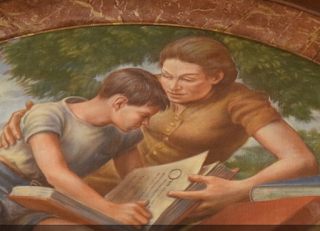 The other murals depict the history of writing--words carved in stone tablets, copied by hand, set in Gutenberg's press, and eventually the mass production we have today.