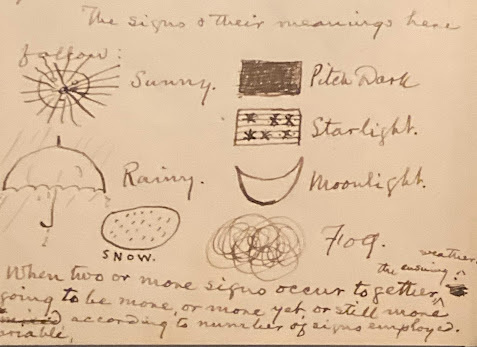 As you see, he created symbols for the weather to save himself the trouble of writing out the descriptions. Aha, I thought. I could do this too! (I confess I'm a reluctant describer. )