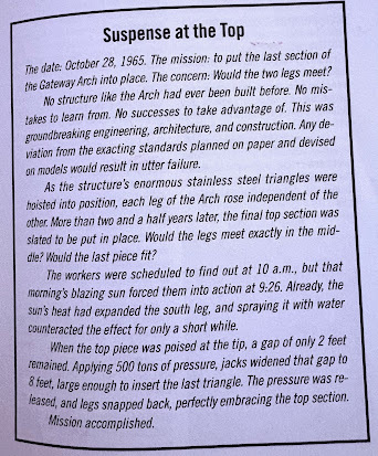 Although the story currently stands on two solid legs – the beginning and the ending – the middle is still a big question mark. In theory, it should work but, in my mind and on a MUCH smaller scale, it’s like I’m plummeting toward the moment below; this from City-Smart Guidebook: St. Louis (1998, Avalon Travel Publishers) by Jody Feldman (yep, that’s me, too).