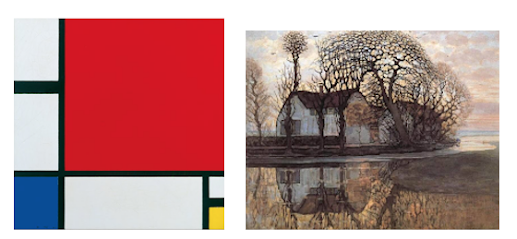 Two styles. Two color palettes. Two artists. Right?The first painting is obviously Piet Mondrian's Composition with Red, Blue and Yellow (1930).The second, Farm Near Duivendrecht (1916) by...Piet Mondrian.(As an aside, after World War I, Mondrian immersed himself in the Paris culture of artistic innovation which triggered this change in style.)