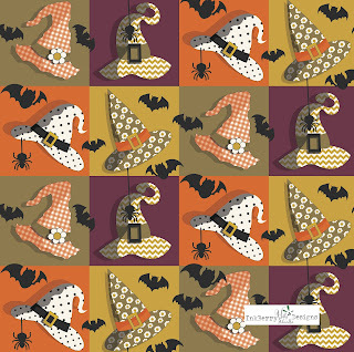 In pattern design, it can be one of the most important things: the right contrast to make your images pop. In order to get the contrast right in my latest (a Halloween pattern), I put each of my witch's hats on a different color, making a kind of checkerboard background.