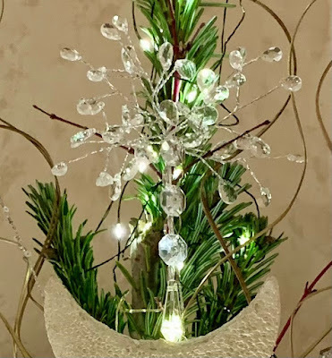 The struggle continued. I was uncertain until nearly the end, when an unplanned combination of materials happened at the top. First, I placed a little crystal, decorative pick on top of the moon. To me it looked like a little tree. A day later, simply to hide the silver wire that formed the pick base, I hung a chandelier drop over it. When I climbed down the ladder, I looked up and saw a silver tree/angel with two red, uplifted branch arms (branches wired in earlier). It looks like a celestial tree at the top of the earthly, green tree.