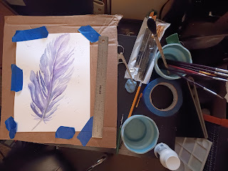 Work in progress: A watercolor feather. First time I've used watercolor in this century. This has been happening for the past ten years or so.