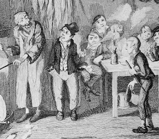 George Cruikshank original engraving of the Artful Dodger (centre), here introducing Oliver (right) to Fagin (left)