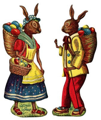 Here are two hard-working rabbits. They've got a lot of eggs to deliver. And a lot of kids to visit. I'm glad to see them in sensible shoes and with backpack baskets. You can carry a lot more that way. But is what they're carrying really essential? I love candy and I eat a lot of eggs, but let's be real. Jelly beans???? (Apologies to those of you who really do like them. I suspect my father only pretended to enjoy the purple ones because someone had to eat them.)