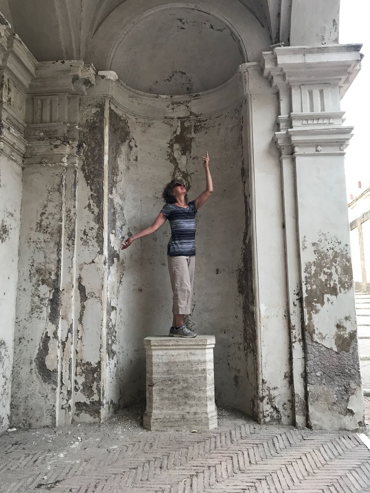 A niche can also provide something to play against. I like this photo because it upends our expectations. The niche leads us to expect an antique statue made of cool marble. What a surprise to find a woman in rumpled khakis and old sneakers, doing her imitation of "art."