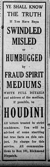 Richmond Times Dispatch 01 Dec 1922Spiritualism was a religious movement based on the belief that the dead and the living could have contact with each other. Houdini fought against fraudulent mediums and even testified before Congress in 1926. His goal? To put the fraudulent mediums who preyed upon the grieving out of business.