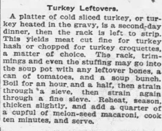 Out of curiosity, I looked at newspapers from 1921 to see how the Jazz Age handled leftovers. I’ve never made turkey hash or croquettes, but turkey noodle soup is a favorite when it’s cold outside. Not sure what melon seed macaroni was, a quick Google search said it was another name for orzo.