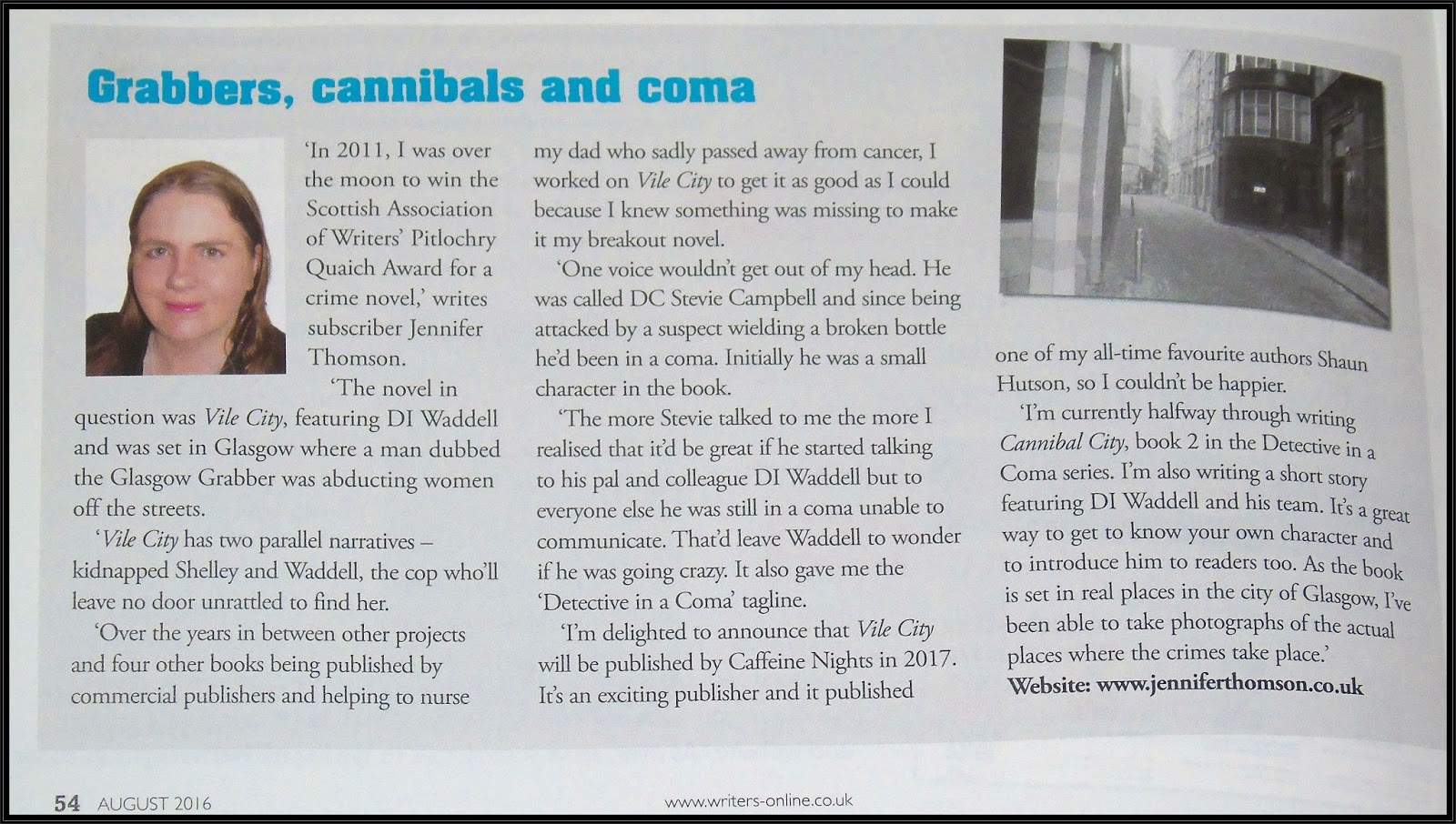 I was delighted to be featured in the latest Writing Magazine where I spoke about the origins of Vile City and in particular Stevie Campbell, the character who just wouldn't stop talking to me.