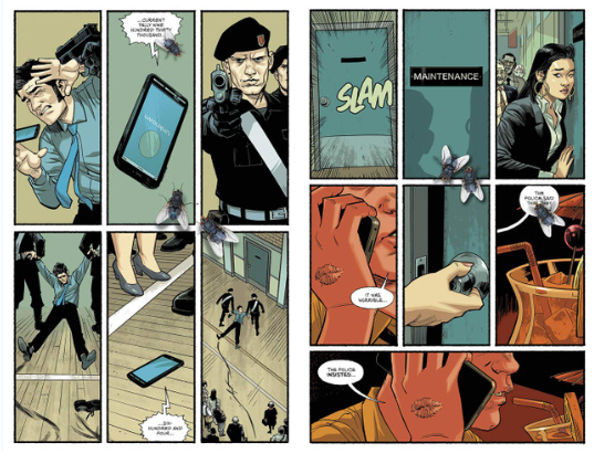The center circular panel is drawn as though on top of a page of 2×4 panels. The trompe l’oeil techniques are less obtrusive (no white gutter surrounds the circular frame which appears to obscure the edges of talk bubbles and other minor image content), but the conceit is the same.