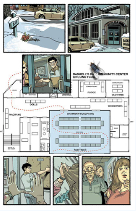While Stewart’s explicitly trompe l’oiel pills and flies are atypical in the comics medium, his layouts are arguably universal: a comics page is a rudimentary trompe l’oiel depicting material panels arranged as though atop the actual surface of a page.