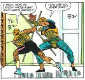 Elsewhere, another Black superhero, Dwayne Taylor, AKA Night Thrasher (introduced December 1989, one month before Rage) trains with his Black father figure, Chord, echoing the Falcon’s attitude: