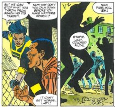 When the Sons of the Serpent incite a riot by challenging protestors outside a Brooklyn police district (“The time has come t’ eat the insects which are burrowing under the White skin of America!”), Night Thrasher’s team, the New Warriors, divide the two sides, with the Black female Silhouette chastising a Black man for throwing a bottle at the Sons: