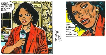 Nicieza’s and Epting’s Black female newscaster narrates: “This was the scene two days ago as videotaped by an alert bystander.”