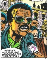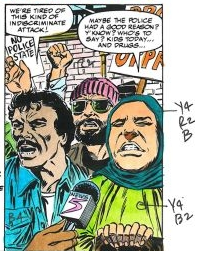 Last week I began this two-part post on the Black superhero Rage and his use in an Avengers story responding to the beating of Rodney King in 1991. The first issue begins with a newscaster’s captioned voiceover: “The videotape of what has been dubbed ‘The Carmello Clubbing’ has been burned into the collective mind of New Yorkers — — and their opinions of the matter are as incendiary as the act itself!”