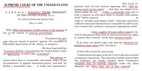 And most recently, on May 16, the Supreme Court wrote again: “‘[T]he Fifth Amendment entitles aliens to due process of law in the context of removal proceedings.’ … We have long held that ‘no person shall be’ removed from the United States ‘without opportunity, at some time, to be heard.’ … In order to ‘actually seek habeas relief,’ a detainee must have sufficient time and information … notice roughly 24 hours before removal, devoid of information about how to exercise due process rights to contest that removal, surely does not pass muster.”