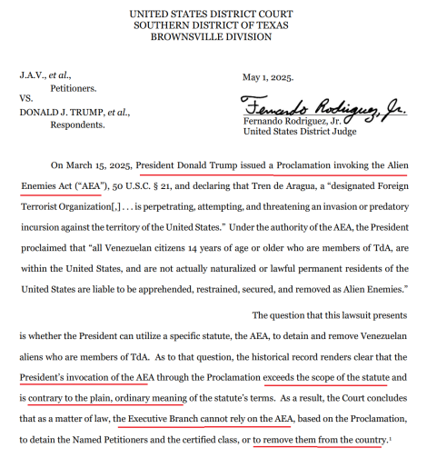 On May 1, Judge Rodriguez of the District Court of Southern Texas ruled: “the President’s invocation of the AEA … exceeds the scope of the statute and is contrary to the plain, ordinary meaning of the statute’s terms… the Executive Branch cannot rely on the AEA … to detain the Named Petitioners and the certified class, or to remove them from the country.” Judge Rodriguez was appointed by Trump in 2017.
