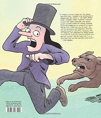 Happily, none of this is confusing—because, since the art world is absurd, why shouldn’t time be too? Even Thurber’s chapter divisions seem capricious, since scene leaps between page turns are often more demanding. My favorite three-page sequence segues from a vampire bat flying out of the art professor’s window (having just paid him for suppressing the next generation of aspiring artists) to an art student jumping from a funicular to avoid applying to grad school (don’t worry, his story picks up even more abruptly in art heaven eighteen pages later—though where the hell did that funicular come from?) to Ivanhoe’s squire Walter recapping his knight’s origin story, which, oh yeah, that was interrupted ten pages earlier by a floppy-eared Matthew Barney tapdancing himself into a bottomless pit. No, wait, that’s actually Cupcake dressed as Barney in a screening of his final project.