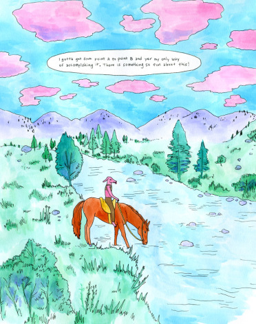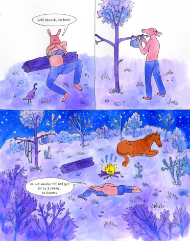 Doggirl’s setting is more realistic than her too. While Hanawalt’s style creates a minimalistic impression, pausing on an image allows the eye to travel over a surprising range of details—most of it in the rendering of desert and mountain plants. This world is further deepened by Hanawalt’s colors, which highlight the quirks of her brushes, giving watercolor texture to otherwise flat plains and barren skies. The openness of the western setting is also reflected in the formal choice of her unframed panels, usually three or four per page. The physical format of the book is small, about seven and a half by six inches, but the dimensions are offset by the expansive layout and bright color palette.