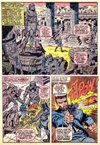 Kirby built the Marvel house style on a 3×2 grid and punctuated it with an occasional 2×2. After both Kirby and Steranko left Marvel, Kirby’s flexible page schemes would give way to a norm of irregular layouts, fluctuating between 2-, 3-, and 4-rows, with an open base pattern. Kirby’s Silver Age layouts were gone.