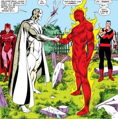 Only, no wait, that’s not it either, because next it turns out the Vision and the Torch really are the same person but split in two when a time-traveling supervillain manipulated their timeline. For a while the Vision half was dead and his identity may or may not have been inhabiting the sentient armor of the evil time-traveler’s non-evil teen-age self.