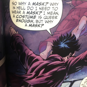Finally, to reassure himself that the ghost of Frederic Wertham wouldn’t haunt his dreams, calling his all-star Batman and Robin a wish dream of two homosexuals, Miller has Robin use the word “queer” as a derogatory term towards Batman on multiple occasions.