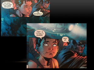 Miller’s novel was written in an age far more accepting of homosexuality than the 1940s, but is more homophobic than the original Detective Comics, and its content actually prevents “camp” gay readings. I would argue Miller had Wertham’s quote about homosexuality in the original comic book written as a checklist on his desk as he wrote All-Star. In this novel, Batman and Robin not only lack devotion to each other, they hate each other. Instead of using a term like “rescue” for what he did when saving Robin from the scene of a violent crime, Batman says, “I’ve kidnapped a traumatized youngster and drafted him into holy war”. After being with Batman for only a few minutes, Robin thinks to himself, “I hate this guy”, and continues to say this throughout the story.