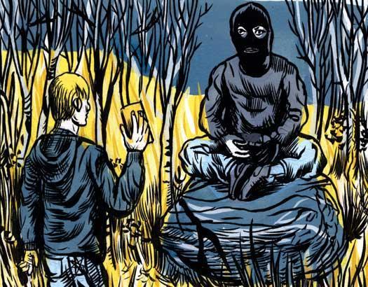 Two stories unfold simultaneously. In the left column, Mina and her friends drive to a remote mountain cabin to spend a night partying in the woods (yes, a hackneyed genre, but stay tuned). In the right column, Mina’s twin sister Gemma returns to the cabin months later to investigate the deaths of her friends. But the two stories also flow back and forth across the page as the sisters foreshadow and relive the same moments. Or at least that’s how things start out. The relationship between the “sisters” gets a lot more complicated, which scrambles the layout too.