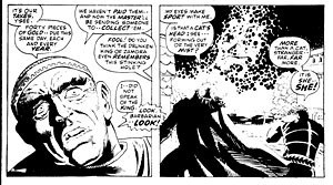 In the first image, artist Dave Gibbons draws the shadow of a statuette cast over the face of a frightened man kneeling on the floor. The second image shows the statuette in the fist of an attacker. Taken together, spatial closure is required to understand that the two images occur within a few feet of each other, with each image drawn from one of the two men’s points of view; this is true even though the white background emphasizes the attacker’s action but eliminates all other setting information. The second image also requires temporal closure because the statuette is behind the attacker’s head at an angle that would not cast the shadow seen on the victim’s face in the first image. Gibbons therefore also depicts a movement forward in time during which the attacker has cocked his arm back to strike.