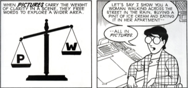 Associative: A metaphorical relationship is depicted between two images in which one image is understood to represent some idea about the other image. (Though McCloud does not identify this type of closure, Jessica Abel and Matt Madden in Drawing Words Writing Pictures add “symbolic” to McCloud’s list of transition types. Such symbolic transitions require associative closure.)