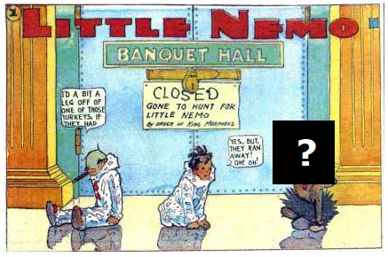 The October 22, 1905 edition of Little Nemo in Slumberland includes a drawn frame that appears to overlay the top row, dividing the image into three continuous panels with a title plaque nominally protruding into the viewer’s space. McCay’s drawing style is comparatively simplified, reducing the trompe-l’oeil effect while still establishing its visual logic.