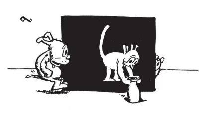 Though still “done in line,” when drawn diegetically in front of the black sheet, Ignatz’s limbs and tail are not black lines but white ones. Where other “white” objects are rendered by drawing black marks around them, these white areas do not appear to have been drawn directly and so were, prior to the newspaper printing process, initially made with white ink applied on top of the black ink of the black panels. Ignatz’s appendages, being only the width of a line, require contrast to be legible. As a result, since a white mouse is not diegetically invisible in front of a black sheet, the figure’s black lines must become discursively white to remain visible.