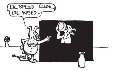 When the character drinks from an “INK” bottle, the ink is presumably black, though the bottle is the same opaque white as the milk bottle. The figures also seem to hover several vacillating inches off the ground, and while the other characters and objects (including both emptied bottles) cast crosshatched shadows beneath or beside them, Herriman draws no marks in the areas representing the three-dimensional space before the sheet. The comic offers no diegetic explanation for the impossibilities, adding to the implicit effect of Krazy Kat appearing not diegetically “in front of black sheet” but discursively within a black panel.