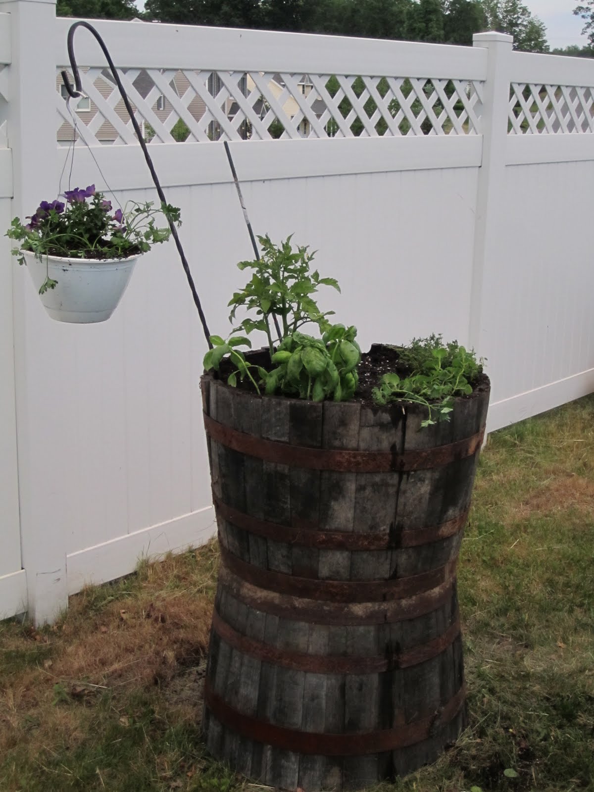 This year I went small, last year not at all, but my new strategy involves whiskey barrels (yes, once again whiskey saves the day). Previously I'd planted in them, now I doubled up, so the top barrel half is raised waist height for me (I'm 5'9"). Fingers crossed this will keep the critters out of my stuff. As an added protection, I planted a Shepard's crook into the barrel half, and hung a planter off it filled with the woodchuck's favorites: petunias and flat leaf Italian parsley. The main barrel has cherry tomatoes, more parsley, basil, Greek oregano, and German thyme. Very international. Smells amazing! Especially in the rising heat.