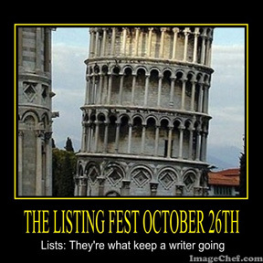 I decided to join the Listing Fest by Alex Cavanaugh and Bish Denham a while ago, and today is the day. So I decided to post a list of things that I can’t possibly all do in a single week (unless I’ll turn into super-writer-woman this second). NaNo is approaching like a runnaway fright train, and this year, for the first time, I’m not ready. Oh, I did all my pre-planning and have the time set aside, but there are so many things I still need to do before I can use the time for writing. Look at my list: