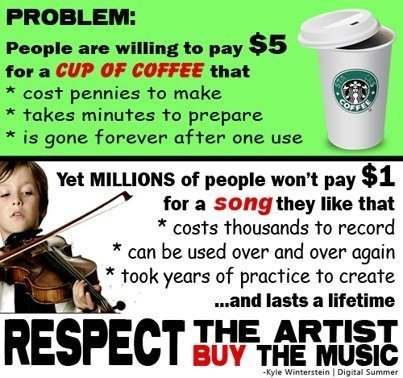 I’m from a family of songwriters/singers. I was in a leadership class several years ago, and the topic was ethics. The moderator asked who thought it was wrong to download music for free (this is when those ripoff sites were first proliferating). I was the only one who raised my hand. I was shocked and appalled. These were educated people, who were tops in their respective fields. But not one them considered what it took to create that song that they so easily downloaded for free or burned an illegal copy for their friends. When you download music for free — unless the artist is offering it as a gift or incentive — you are invalidating the work that went into that project.