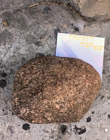 Это кто-то, получается, не захотел оставлять камень на улице, нашёл проход во двор (не очевидный и часто закрытый), вычислил дверь чёрного хода русского культурного центра и оставил камень возле неё. Моя версия: это был человек, приходивший в русский культурный центр раньше, на какие-то мероприятия, достаточно регулярно, чтобы знать про чёрный ход. Или даже бывший сотрудник (но именно бывший, а то открыл бы дверь ключом и внутрь камень занёс). Получилось здорово: никто пришествия камня с той стороны не ждал. Хорошо, что мы решили выйти во двор покурить.