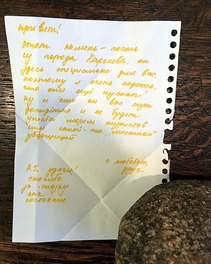 Свидетелем второго чуда про камень стала сама друг Рената. Пришла развешивать выставку, а на пороге здоровенный камень с запиской. Приехал к нам аж из Харькова. Ну, то есть, ему помогли добраться добрые люди, привезли. И оставили нам записку. Документальные свидетельства (из Ренатиного телефона) вот: