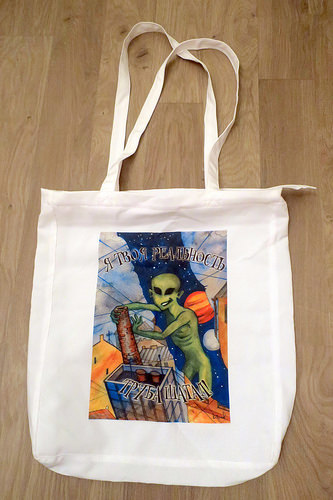 Вчера мне привезли из Киева сумку с Кэтиной картинкой, не тиражную, а сделанную в количестве одна штука, специально для меня, с лучшим в мире девизом: "Я твоя реальность труба шатал". Вот такую: